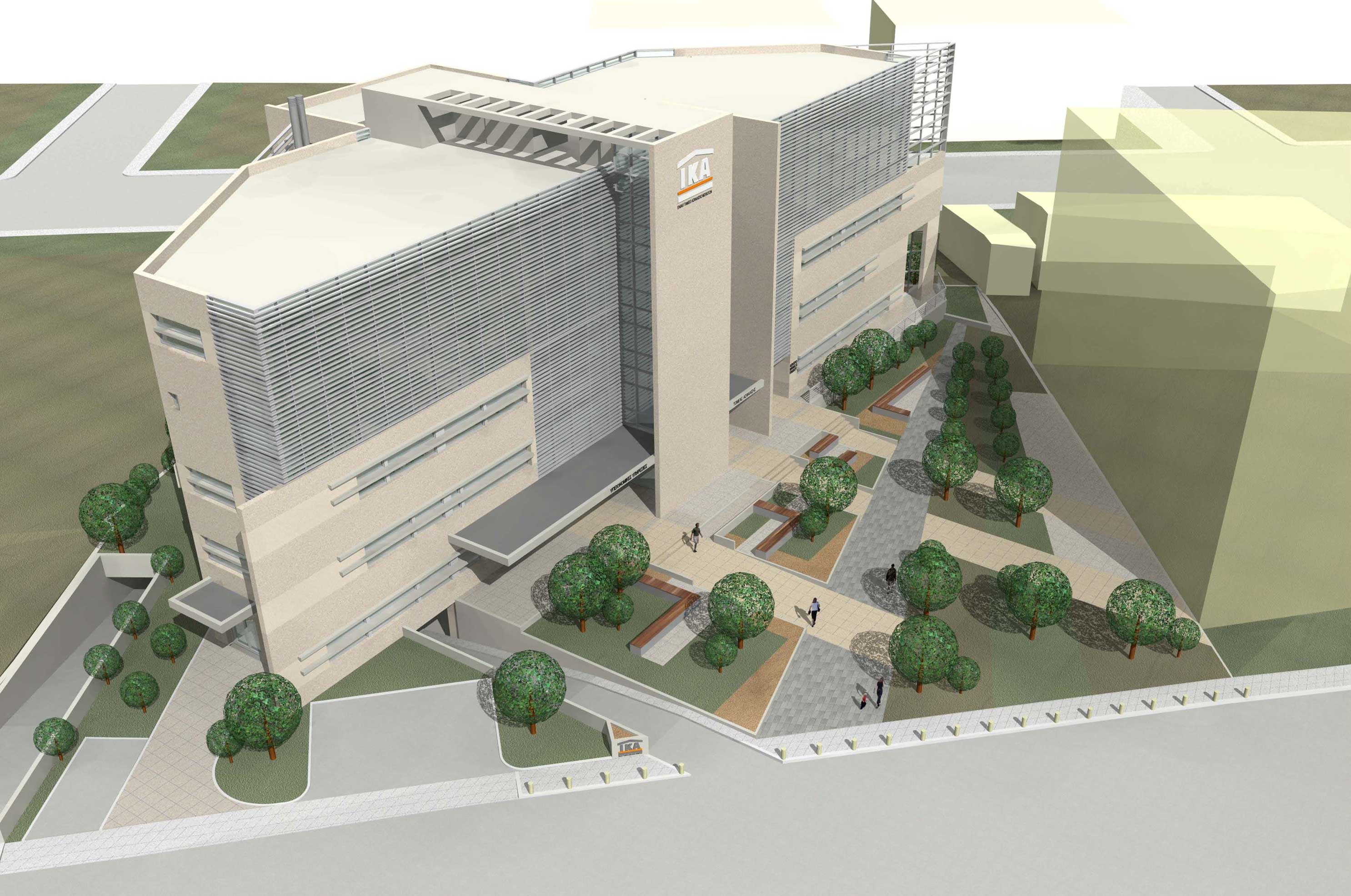 Η μελέτη απέσπασε το Β΄ Βραβείο σε διαγωνισμό με προεπιλογή. Απώτερος στόχος της σύνθεσης υπήρξε η ανάδειξη του δημόσιου χαρακτήρα του Ιδρύματος Κοινωνικών Ασφαλίσεων μέσω ενός κτιρίου εύληπτου και ικανού να λειτουργήσει ως ισχυρό σύστημα αναφοράς και οργανωτικό στοιχείο του χαλαρού, περιβάλλοντος αστικού τοπίου. Η κτιριακή μάζα τοποθετείται σε διαγώνιο άξονα υποχωρώντας και αφήνοντας να δημιουργηθεί ένας εκτεταμένος χώρος πλατείας. Οι συγκλίνουσες πλευρές του κτιρίου και η στροφή του σε σχέση με τον άξονα του δρόμου, ελευθερώνουν παράγωνες προοπτικές φυγές και οδηγούν σε μια μη ορισμένη γεωμετρική μορφή, η οποία από οποιαδήποτε οπτική γωνία παρουσιάζεται συνεχώς μεταβαλλόμενη. Η γραμμικότητα της πρόσοψης του κτιρίου διαταράσσεται από επίπεδες κατακόρυφες επιφάνειες που παραλαμβάνουν και οδηγούν τους επισκέπτες στις κεντρικές εισόδους του κτιρίου, οργανώνοντας με αντίστοιχες χαράξεις, τον υπαίθριο χώρο της πλατείας.